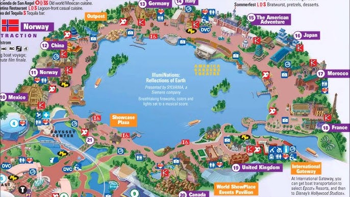 Map Of World Showcase Epcot. EPCOTs World Showcase is centered around a reflective lagoon. It continues the recent trend of Walt Disney World depicting guests with varying abilities in its public facing photos and videos. With rare exception the World Showcase opens at 1100 am.